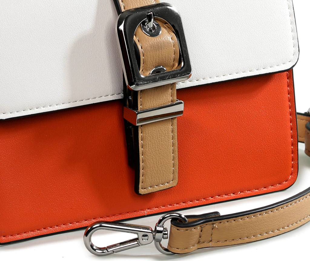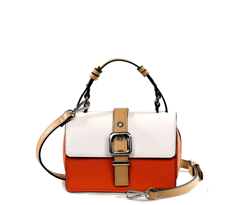 Mini bandolera tipo baúl, combinada, con herrajes niquelados. Detalle de hebilla al frente, cierre metálico y logo grabado en la parte trasera.