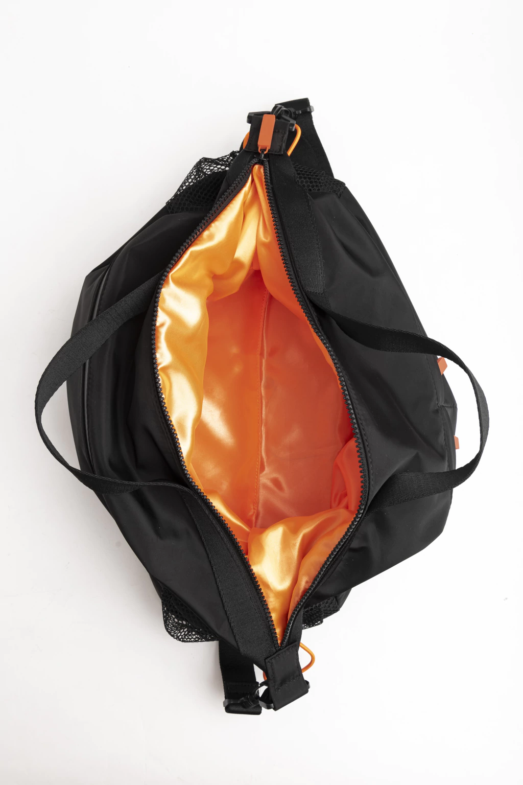 Bolso de nylon, con doble bolsillo delantero con cierre, manija corta y correa larga extensible. Bolsillos laterales de red con elástico ajustable.