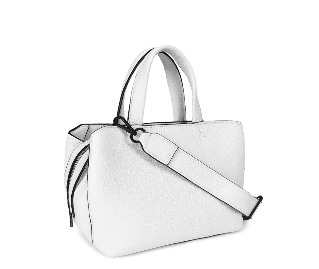 Cartera mediana tipo baul con logo grabado al frente. Herrajes opacos y correa removible.