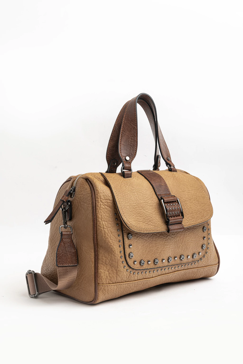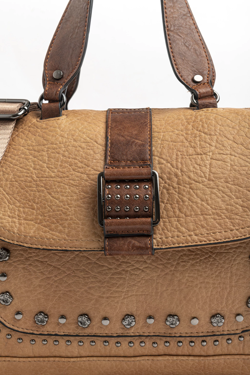 Cartera mediana con hebilla al frente, herrajes niquelados y detalle de tachas y remaches. Correa removible para usarla como bandolera y bolsillo con imán al frente.