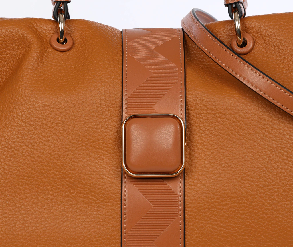 Cartera grande, soft, con detalle de hebilla y relieve al frente. Herrajes en dorado y correa removible para usar como bandolera. División interna.