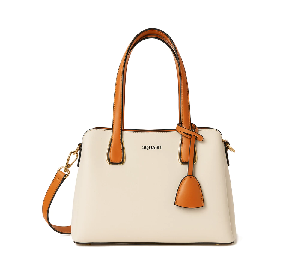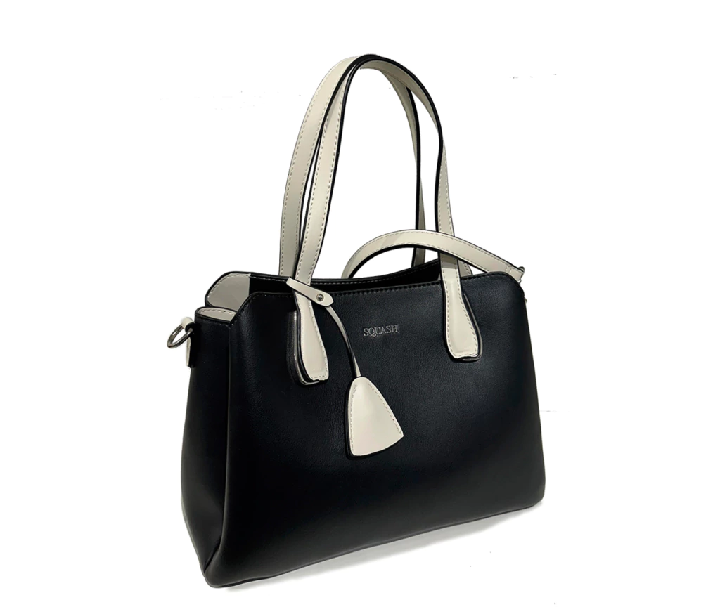 Cartera mediana combinada con logo metalizado al frente. Correa removible y detalle metálico en la base de las manijas.