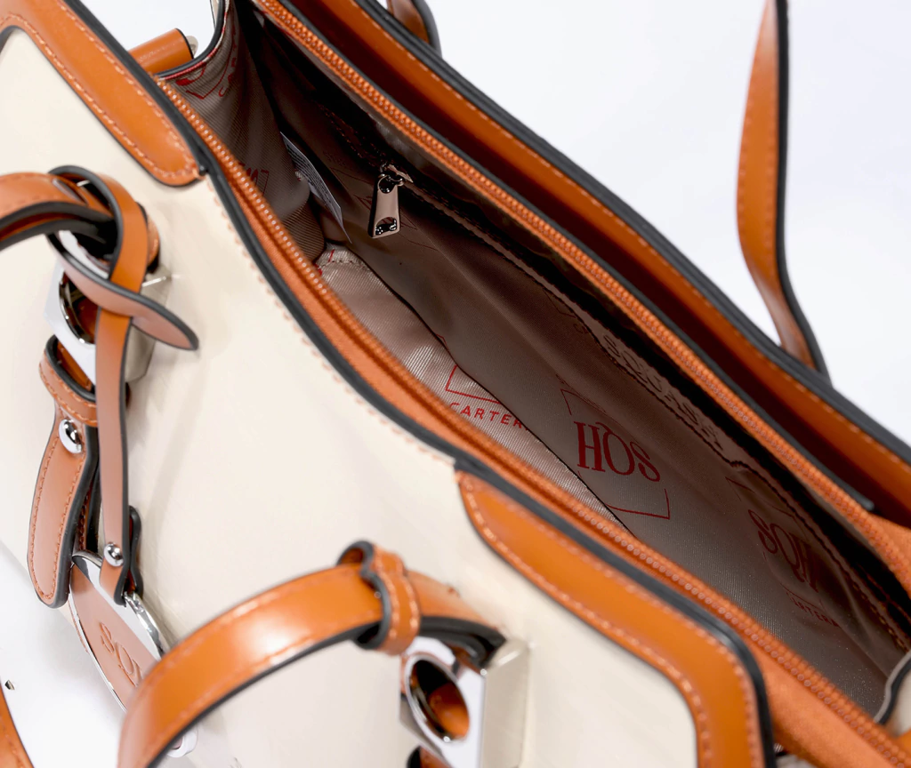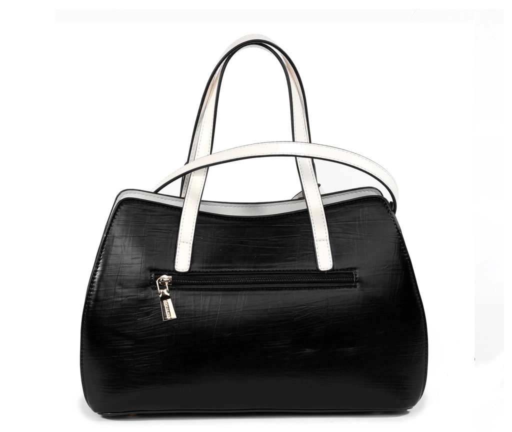 Cartera mediana, combinada, con logo metalizado al frente. Herrajes en dorado y correa removible para bandolera. Textura en la parte frontal.